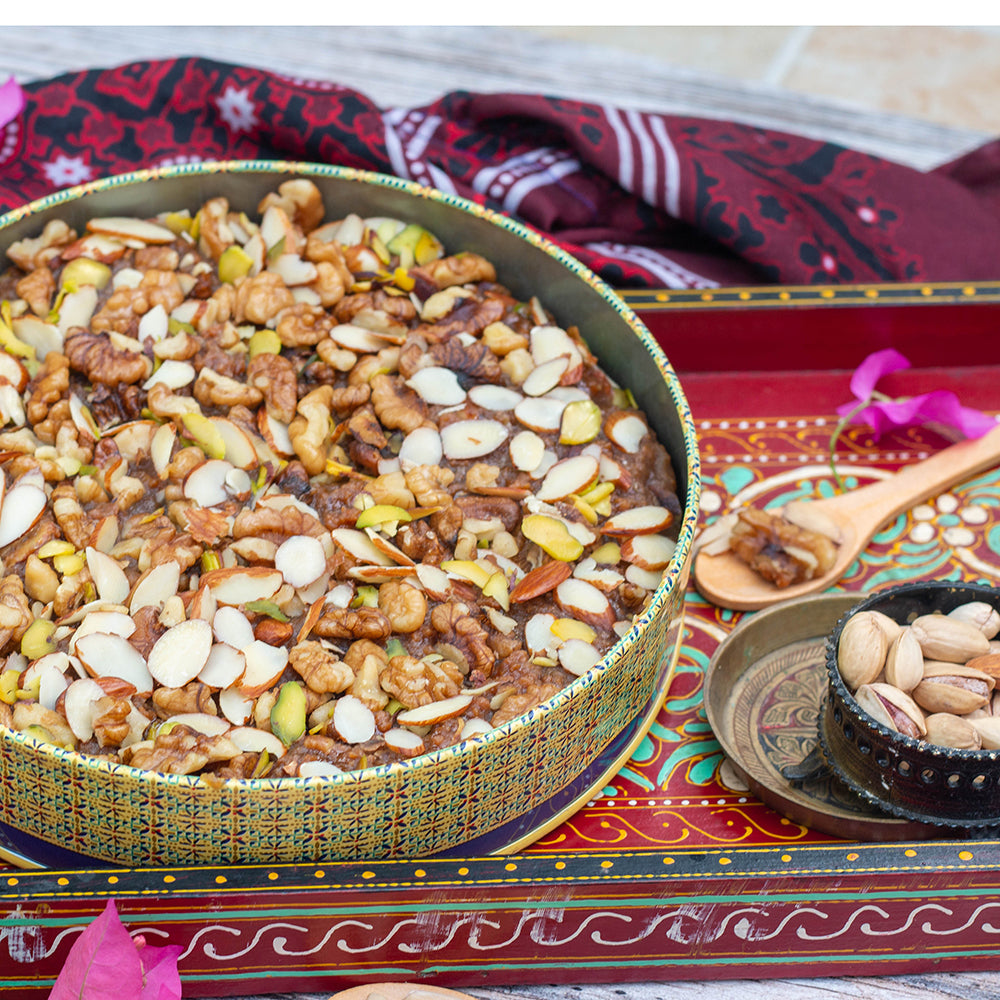 The Badami (almond) topping in our halwa is rich and nutty, with a satisfying crunch that complements the soft and chewy texture of the halwa perfectly. The Akhroti (walnut) topping adds a deep and earthy flavor, with a buttery richness that melts in your mouth. Finally, the Pista (pistachio) topping brings a fresh and slightly sweet flavor that balances out the richness of the other two toppings.